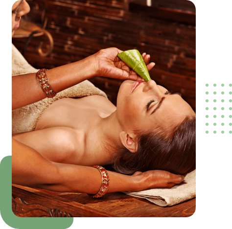 Nasya is an excellent remedy for headaches, migraines, clearing the sinuses and clearing the nasal passage to enhance breathing. The process includes a point stimulating facial massage, followed by herbal steam and administration of oils through the nasal passage.